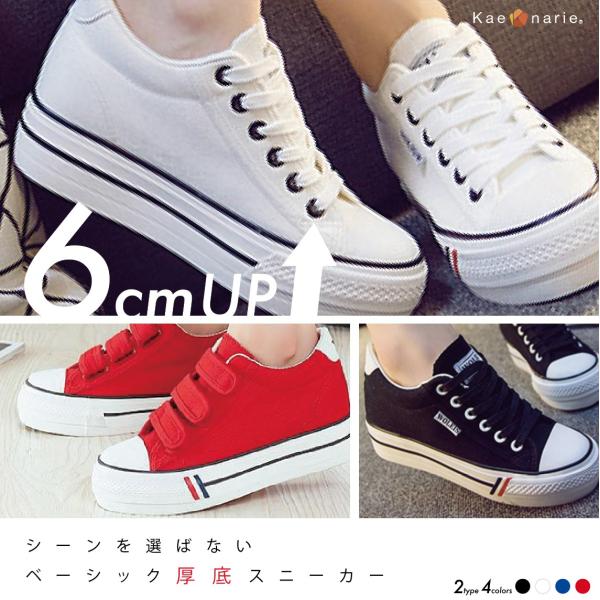 厚底 インヒール キャンバス スニーカー レディース シューズ 美脚/2種4カラー レースアップ・ベルクロ /ホワイト ブラック ネイビー レッド Kaenarie