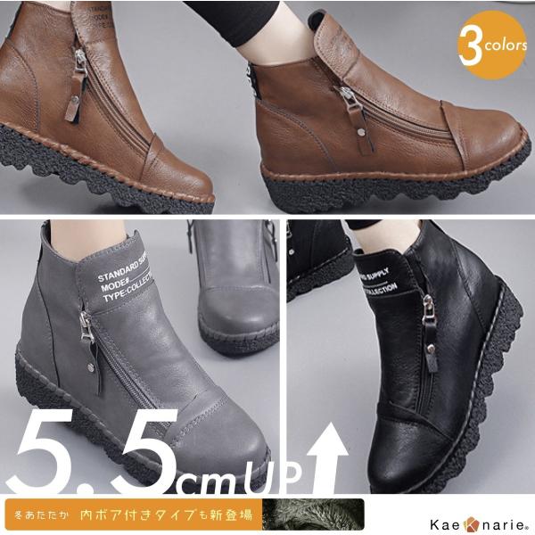 ハイカット 厚底スニーカー ショートブーツ インヒール レザー レディース サイド ジップ 3色 (ブラック ブラウン グレー)/ ナイロン・ボアタイプ Kaenarie