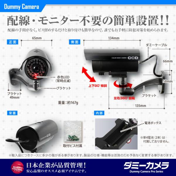 本物の防犯カメラと同じ型を使用し、赤色LEDが常時点滅し、本物の防犯カメラが作動しいているように見せかけます。