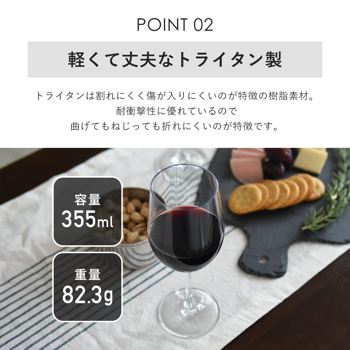 軽くて割れないトライタン素材。ガラスのような透明感のある美しさを持ちつつ、軽量なので持ち運びにも便利です。