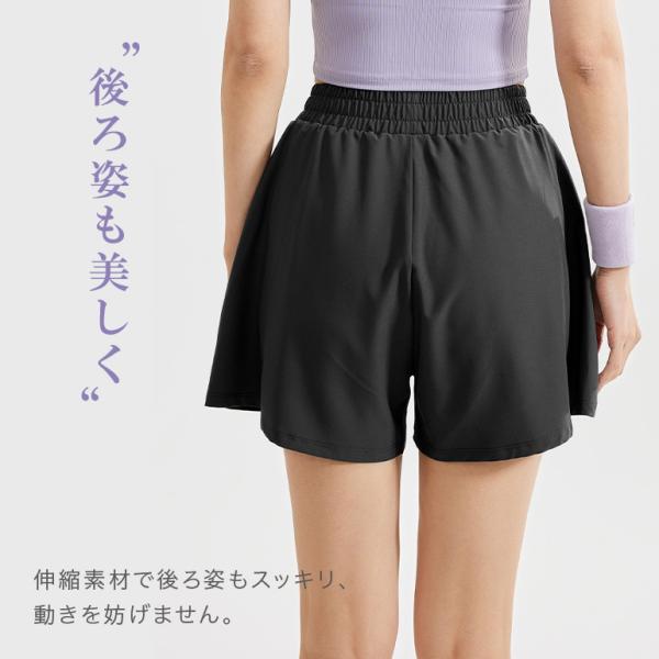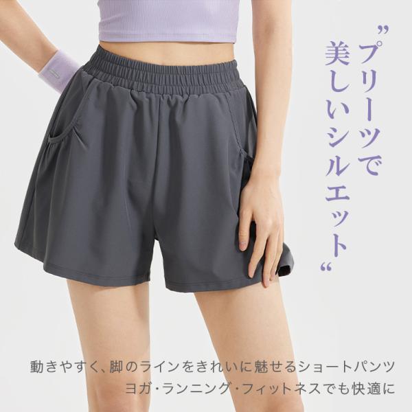 レディース プリーツショートパンツ インナー一体型 ポケット付き ランニング ヨガ ピラティス フィットネス 4方向ストレッチ 高弾性 ドレープ スポーツウェア