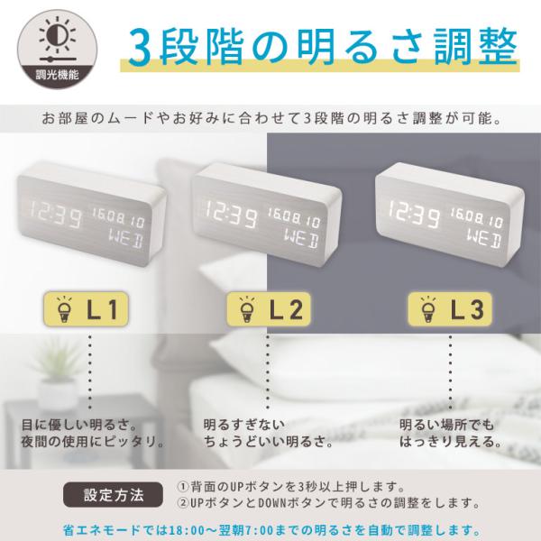・LEDの明るさは弱中強3段階の調節が可能です。・音に反応して点灯 省エネモードをオンすると約20秒後に表示が消灯します。