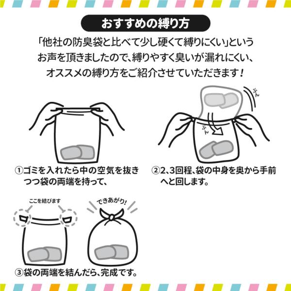 臭いが漏れにくい材質を使用しておりますが、袋自体に脱臭・消臭効果はございませんので予めご了承ください。