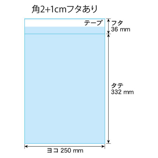 OPP袋 角2ワイド 1cm巾広 テープ付 100枚 30ミクロン厚(標準) 250×332+36mm 透明袋 国産 二つ折り発送