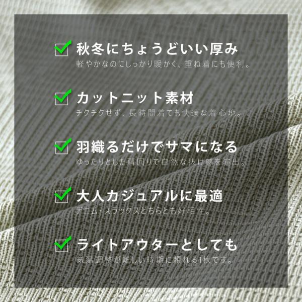 織るだけで秋冬を格上げする、大人のニットカーディガンが新登場!編地で魅せるカーディガンはオシャレで便利な素をすべて兼ね備えた、使い勝手抜群の1枚。カットニットならではの柔らかさと軽さでライトアウター感覚で気軽に羽織れるのが魅力。ちょっと肌寒くなってきた今の季節にもぴったりで、Tシャツの上からサッと着てもきまるバランス感が◎カジュアルからきれいめまで、幅広いコーデにハマるので、1枚持っておくとかなり便利です!