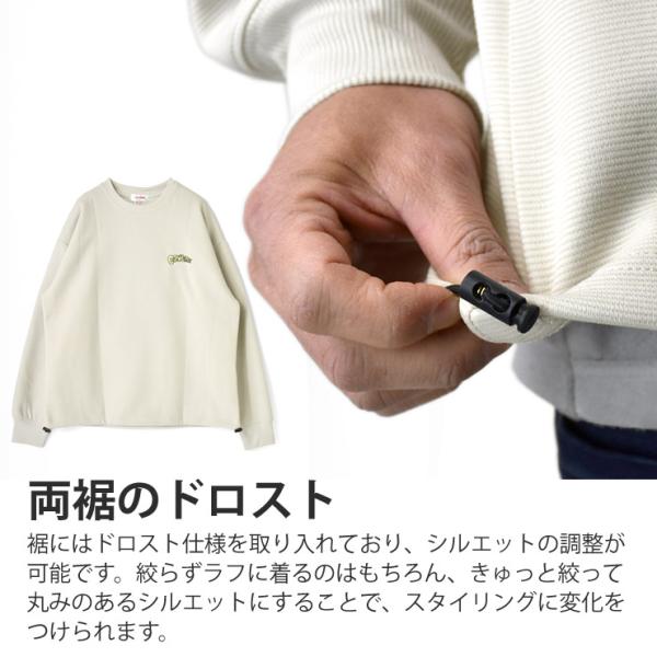 定番ブランドCONVERSEの世界観を活かした、クルーネックスウェットです。フロントはさりげなく、背中には存在感のあるバックデザイン刺繍を配置し、後ろ姿まで抜かりないデザインに仕上げています。さがら刺繍を採用し、立体感のある表情がコーディネートのアクセントになります。裾にはドロスト仕様を取り入れており、シルエットの調整が可能です。絞らずラフに着るのはもちろん、きゅっと絞って丸みのあるシルエットにすることで、スタイリングに変化をつけられます。ワイドパンツと合わせればトレンド感のあるストリートスタイルも楽しめます。