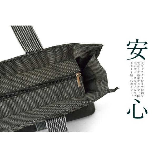 厚手のポリキャンバス素材でシッカリとした印象。間口には天ファスナーが付いているのでうっかり荷物を落とす心配が無く安心。A4ファイルがスッポリ入るのでビジネスシーンでも活躍しそうです。