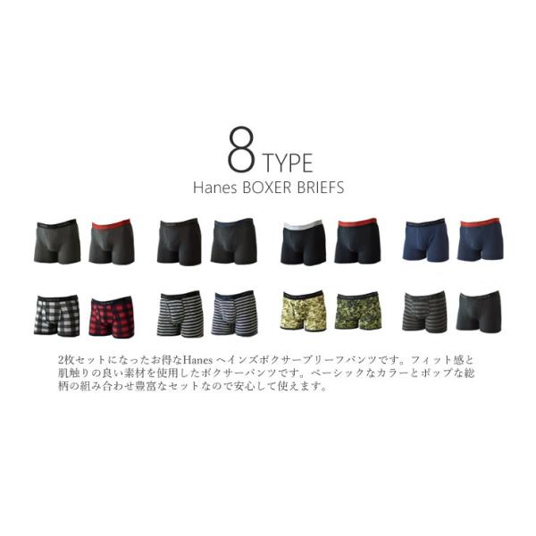 2枚セットになったお得なHanes_ヘインズボクサーブリーフパンツです。フィット感と肌触りの良い素材を使用したボクサーパンツです。ベーシックなカラーとポップな総柄の組み合わせ豊富なセットなので安心して使えます。前開きタイプ。