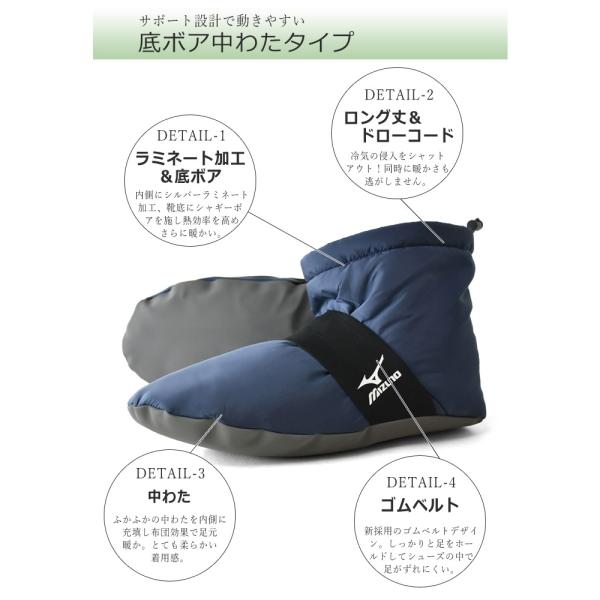 足元の防寒に嬉しいあったかルームシューズがMIZUNOから新登場!内側にふかふかの中綿を詰めた暖か仕様のルームシューズです。足元の冷え対策として効果抜群です。ダウンジャケットを履く感覚で使えとても柔らかい着用感です。滑り止めがついているのでフローリングの上でも滑る心配がありません。部屋履きにはもちろん、キャンプのテントシューズとして活躍しそうです。また、ロングサイズは丈が長くなった事以外にも工夫が施され、内側の底部分がボア底になっています。寒がりサンにもホントお勧めのルームブーツです。