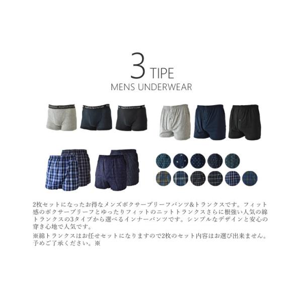 2枚セットになったお得なメンズボクサーブリーフパンツ&トランクスです。フィット感のボクサーブリーフとゆったりフィットのニットトランクスさらに根強い人気の綿トランクスの3タイプから選べるインナーパンツです。シンプルなデザインと安心の穿き心地で人気です。