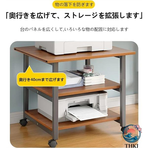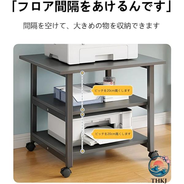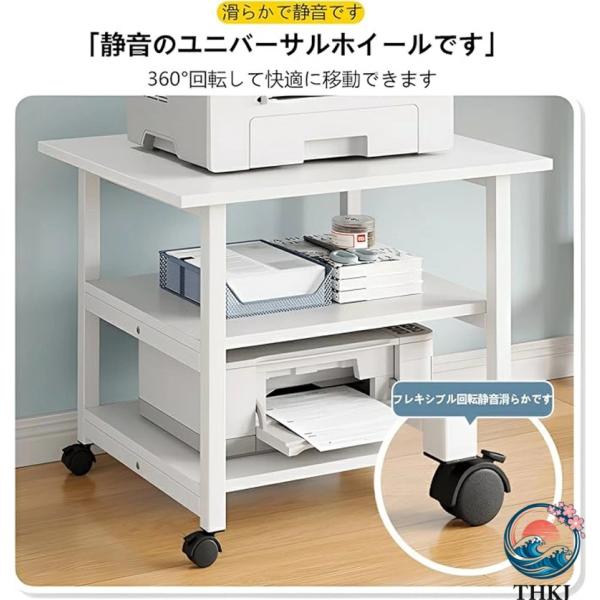 【階層的に収納したり】モノを適切に収納したりします,プリンター機、ファックス機、スキャナー機用に設計されていますが、ほかにも、本、置物、鉢植え、文房具、カレンダーなど小物を分類して置くこともできます,リビング、書斎、寝室、オフィスなどに適しています,家庭生活や仕事に欠かせない収納棚です。