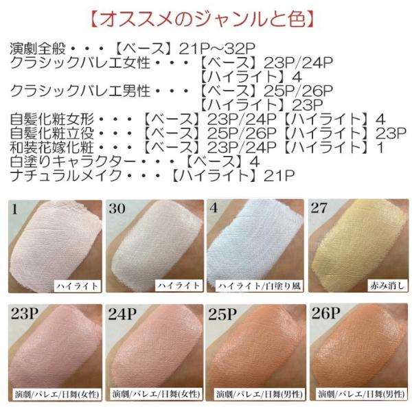色数が豊富ですので巾広い役柄の化粧ができ、和装花嫁、舞踊化粧の下地ファンデーションとしても多く使用されています。