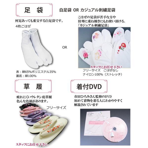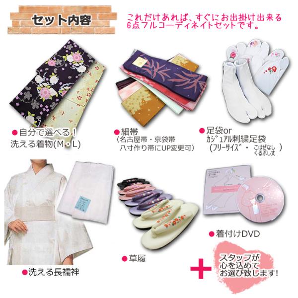 きもの(M/L)を選択、細帯・長襦袢(M/L)足袋・草履・着付DVDを当店でコーディネイトしてお届け。