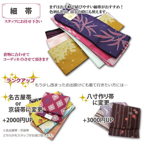 追加料金で細帯を名古屋帯か京袋帯(+有料)・八寸作り帯(+有料)に変更可。