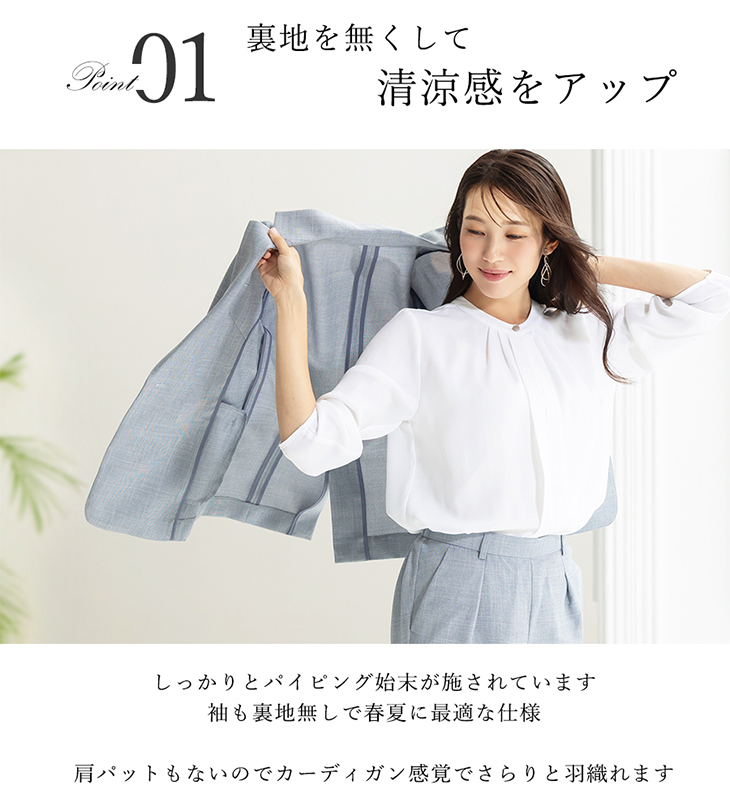 レディース サマージャケット テーラード カラーレス 夏 薄手 洗える スーツ オフィスカジュアル フォーマル 麻調 通勤 軽量 大きいサイズ あすつく