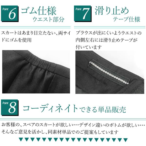スカートは定番のAラインスカートと、スリムな印象できちんと感がある膝丈のタイトスカートの2種類からお選びいただけます。