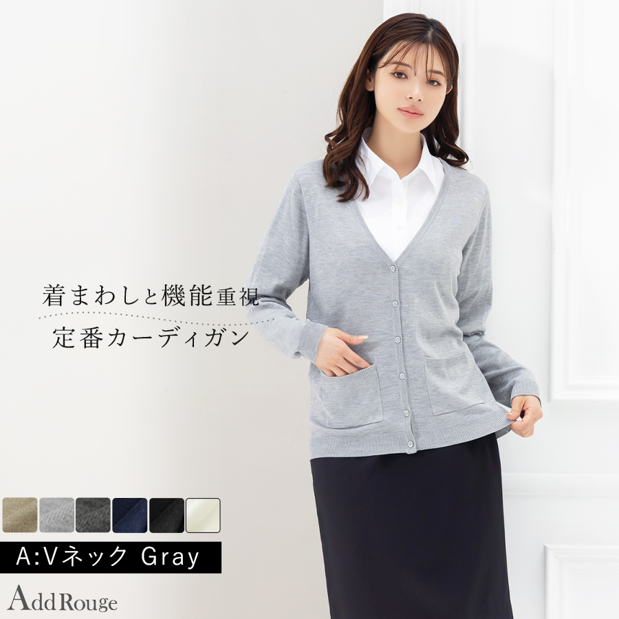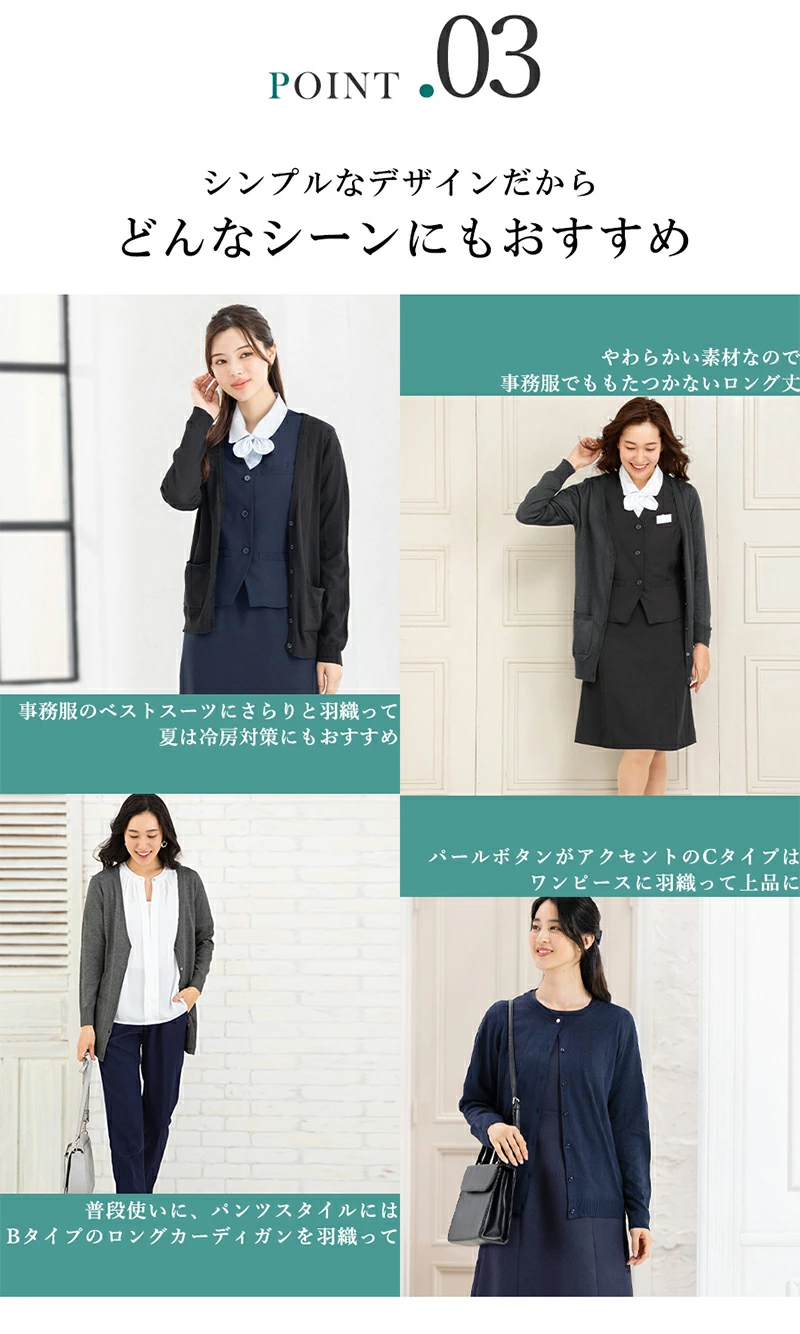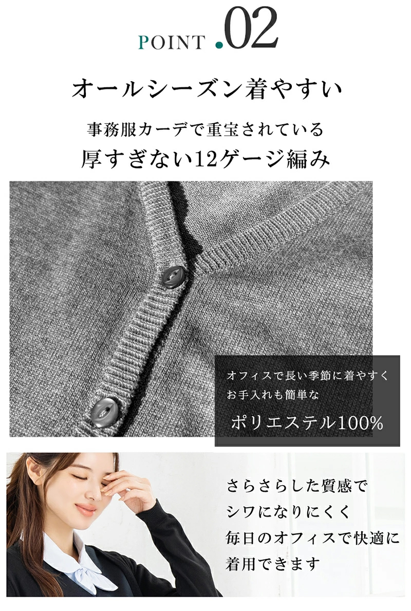 オフィスでの企業制服(ユニフォーム)として使える、ビジネスシーンに欠かせない事務服対応カーディガン。