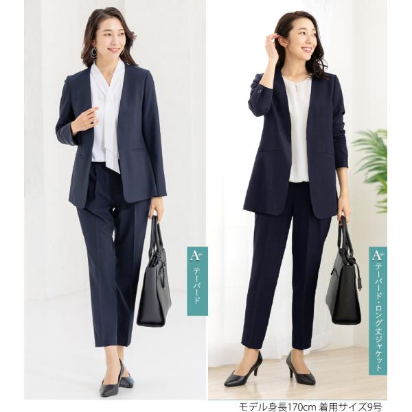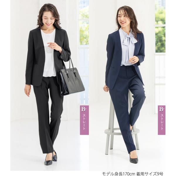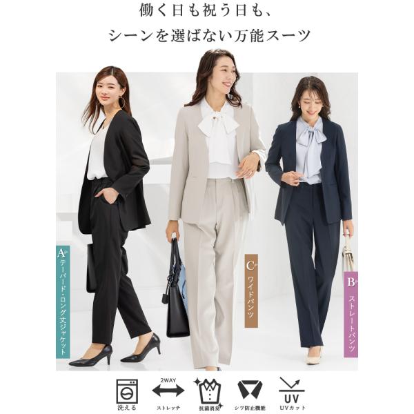 パンツは美脚が叶うテーパードと、王道シルエットのストレート、エレガントに体型カバーできるワイドから選べる、3デザインをご用意。ウエストの後ろがゴム入りなので、長時間ストレスなく着用いただけます。