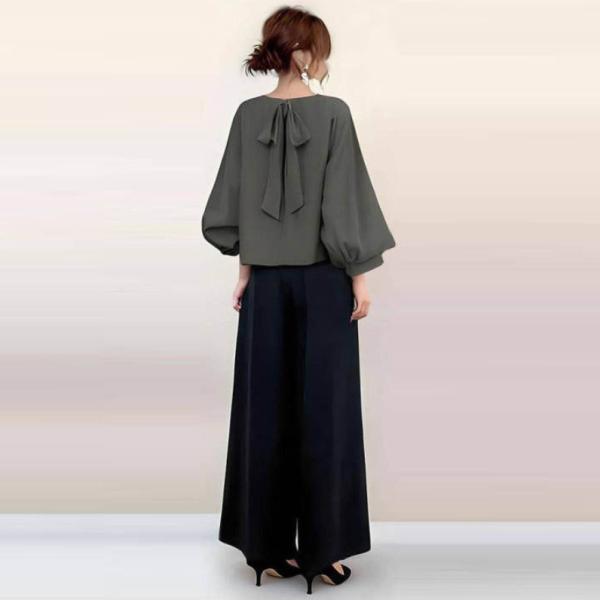 セットアップ レディース 春服 夏服 ブラウス 丸首 八分袖 パフスリーブ ショート丈 リボン ワイドパンツ ゴム ハイウエスト 大人 40代50代 上下セット 無地