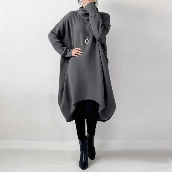 ワンピース 秋物 レディース 長袖ワンピース コクーンワンピース ハイネック 不規則裾 バックタック入れ ゆったり 体型カバー 50代60代 膝丈 ミモレ丈 前後差