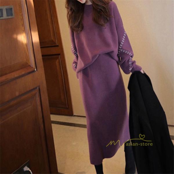 ニットセットアップ レディース 40代 春秋 長袖 ニット セーター スカートセットアップ 無地 ロング丈 オシャレ韓国風 カジュアル 2点セット オフィス オシャレ