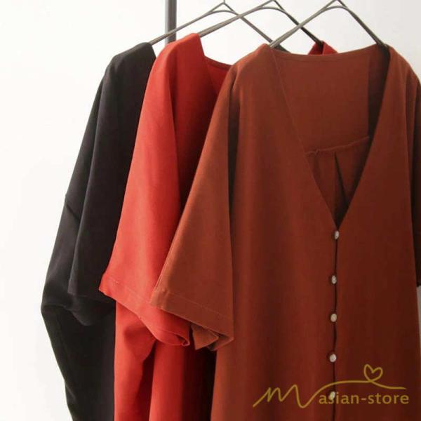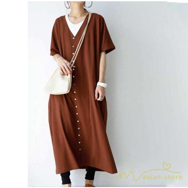 ワンピース レディース ロング 五分袖 夏物 ボタンワンピース vネック 涼感 無地大人 体型カバー 黒 ブルー カーキ ブラウン オレンジ しわにくい はおり