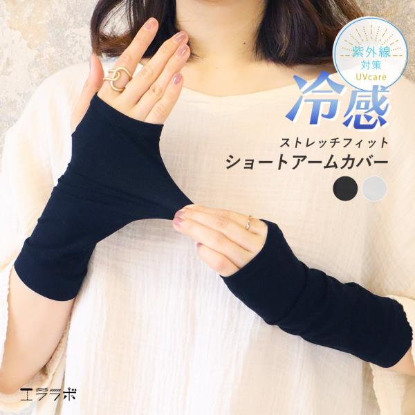 アームカバー ショート丈 接触冷感 UVケア 指穴付き 23cm フィットタイプ ストレッチ 手首が隠れる UV対策 涼しい スポーツ *1-3t *2-9t *y3-12t