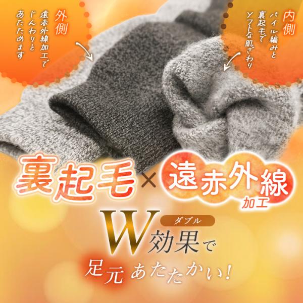 肌に触れる内側はパイル編みと全面起毛でソフトな肌ざわり、外側は遠赤外線加工でじんわりと温めます。