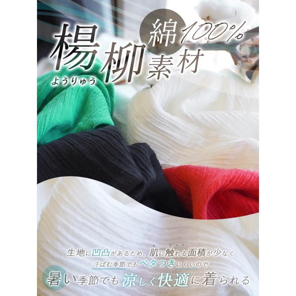 生地に細かな凹凸がある楊柳素材は、肌に触れる面積が少ないため汗ばむ季節でもベタつくにくく、暑い季節でも涼しく快適に着られます。