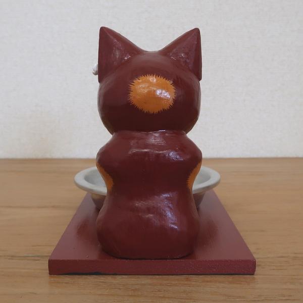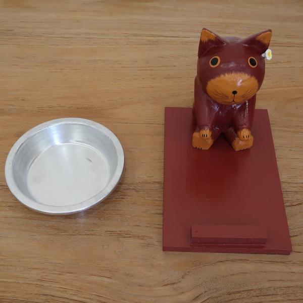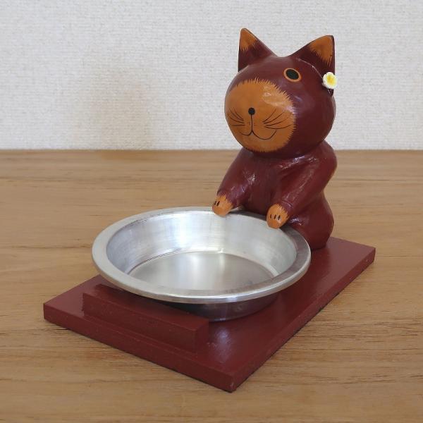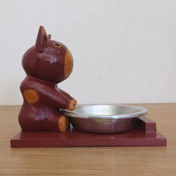バリ猫のキャットフード トレー 猫の木彫りの置物 ブラウン バリネコ オブジェ ペット 水入れ 餌入れトレイ 010283