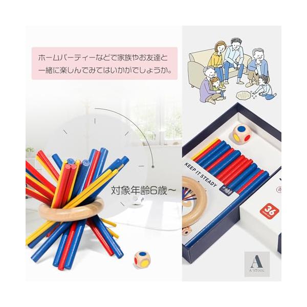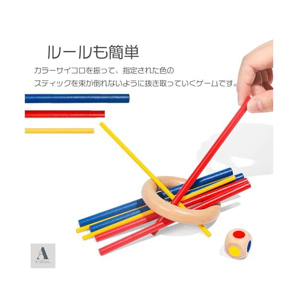 プレーヤーは順番にサイコロを投げて、出た色のスティックを、全体が崩れないように慎重に抜き取ります。