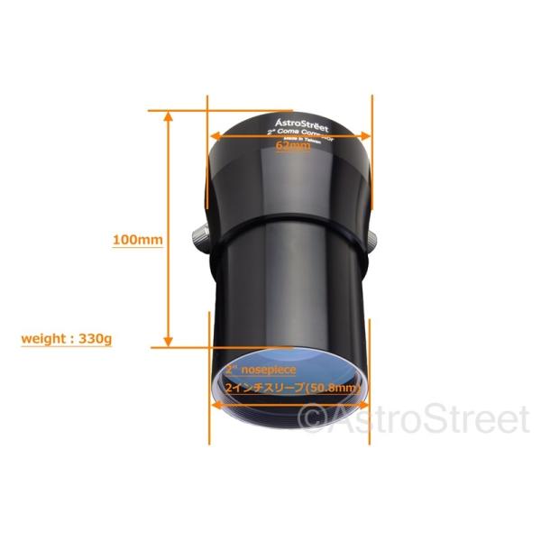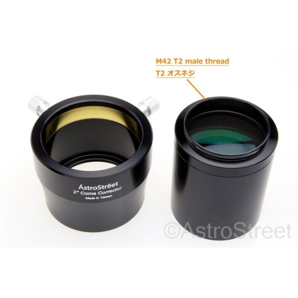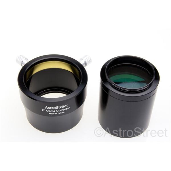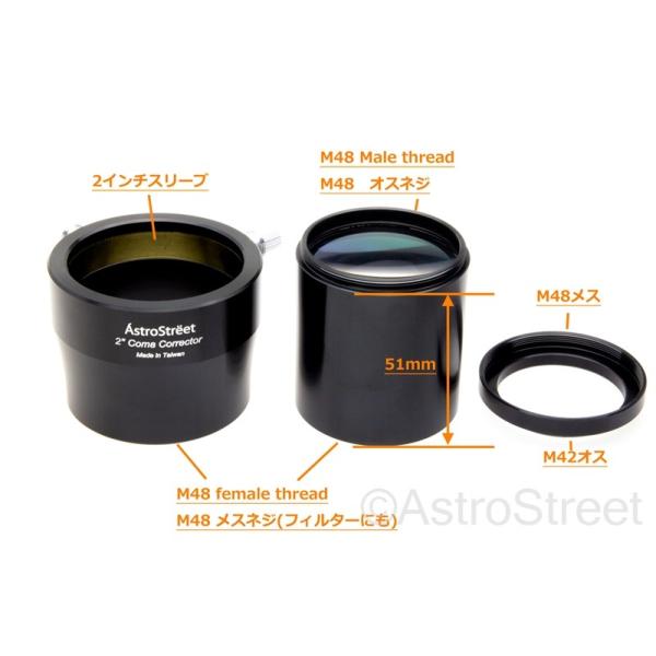 AstroStreet社の2インチ 50.8mm径コマコレクターです<br><br>短焦点ニュートン望遠鏡のコマ収差を改善します。<br>F4.5のニュートン望遠鏡に最適化しておりますが、F3-F6までは十分性能を発揮します<br>写真と眼視両方に対応します<br><br>商品内訳は<br>1)コレクターレンズ本体(2インチスリーブ径、M48オスネジ接続、先端にM48フィルターネジ)<br>2)2インチスリーブ部品(M48接続、真鍮リング締め付け式、留めネジ2本)<br>3)M48-T2(M42P0.75)ネジアダプターリング<br>となります。<br><br>写真で利用する場合は1→3→Tリングを介してカメラ本体という構成に<br>眼視の場合は1→2→アイピースという接続で利用します。<br>レンズは非常に良質なフルマルチコートを施した2群4枚構成で、有効口径が44mm程あり、<br>写真ではフルサイズ機、眼視では広角アイピースに対応可能です<b