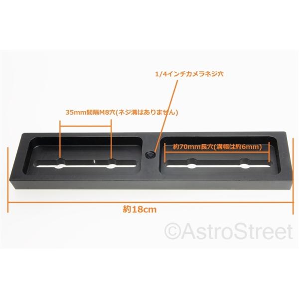 オリジナルの約18cm程のCNC加工アルミ削り出しのアリガタプレートです。<br><br><b>アリガタレールはビクセンのGP系ヘッドに適合します。<br>中央にはカメラねじ穴、中央から左右にそれぞれ70mm程の長さの長穴があります。長穴背面はザグリ加工されております<br>長穴幅は約6mmのバカ穴です。35mmM8に対応するバカ穴が左右それぞれに開けられております<br>アルミ削り出して大変堅牢で高級感があります<br><br>※使用上問題の無いメッキムラなどある場合もございますのでご了承ください<br>[重量]約140g</b>