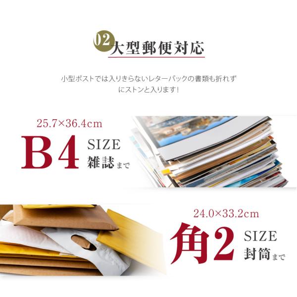 【大型郵便対応】小型ポストでは入りきらないレターパックの書類も折れずにストンと入ります!生活の中で大型サイズの受け取りがよくありますが、本メールボックスは大型サイズの対応が可能です。A4サイズの封筒、雑誌も楽々入ります。