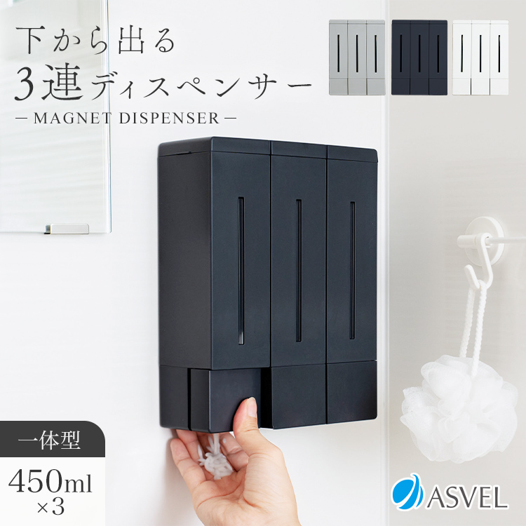 下から出てくる 浮かせる ディスペンサー マグネット 450ml×3 3連 3種 コンパクト お風呂 おしゃれ アスベル 詰め替え容器 リフィルボトル ボトル