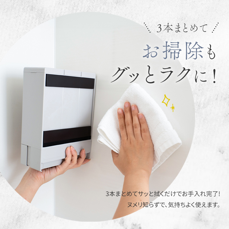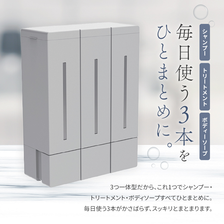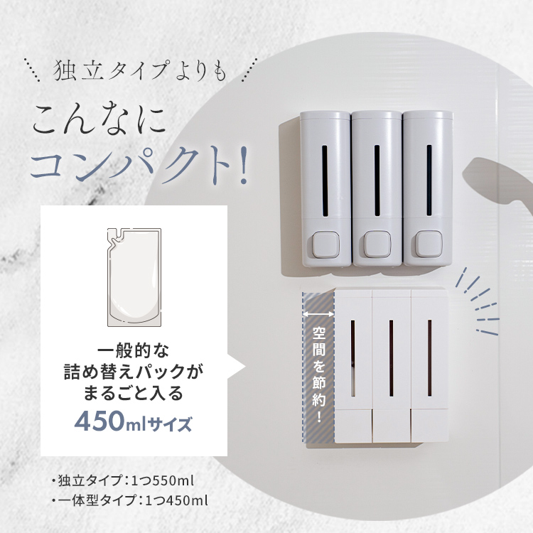 システムバスの壁面に最適♪マグネットの力で壁につけれるディスペンサー登場。省スペースで3種類の詰替えできるコンパクト設計(各450ml容量)。