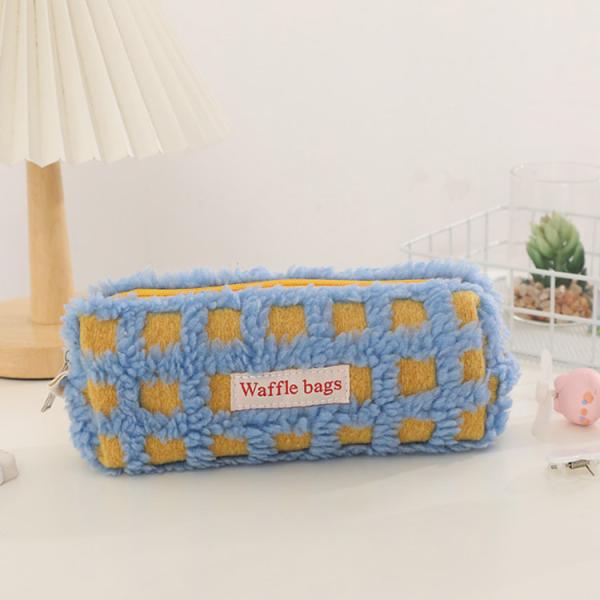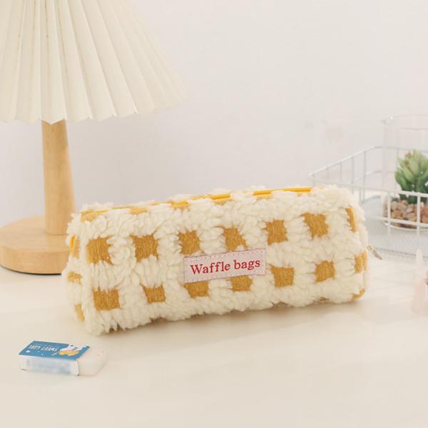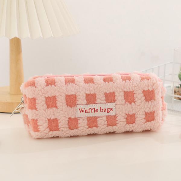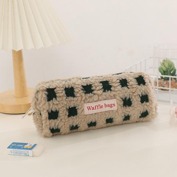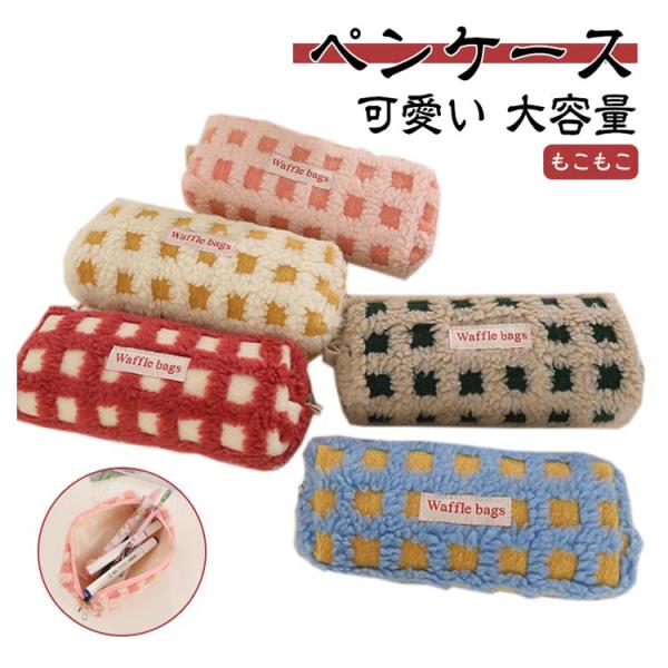 全5色 ボア ワッフル ペンケース かわいい 高校生女子 オシャレ 筆箱 筆入れ 大容量 シンプル ブロック チェック柄 文具 韓国風 おしゃれ 可愛