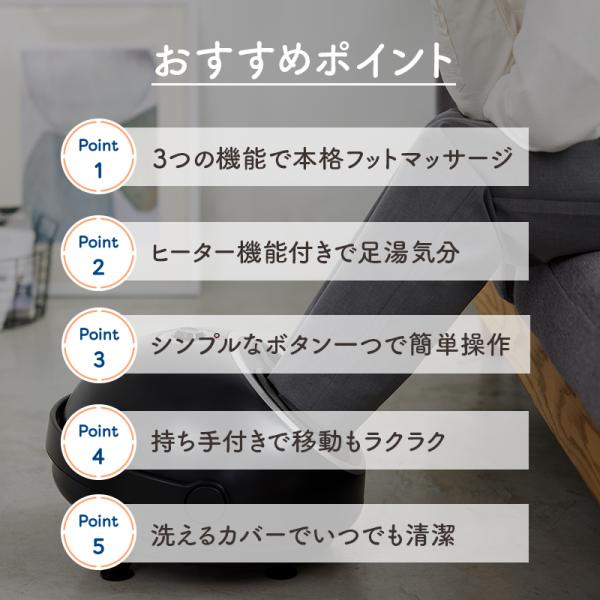 エアバッグ、もみプレート、ローラーの3つの機能とヒーター機能で足の疲労を回復
