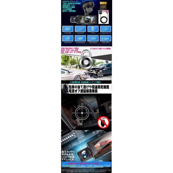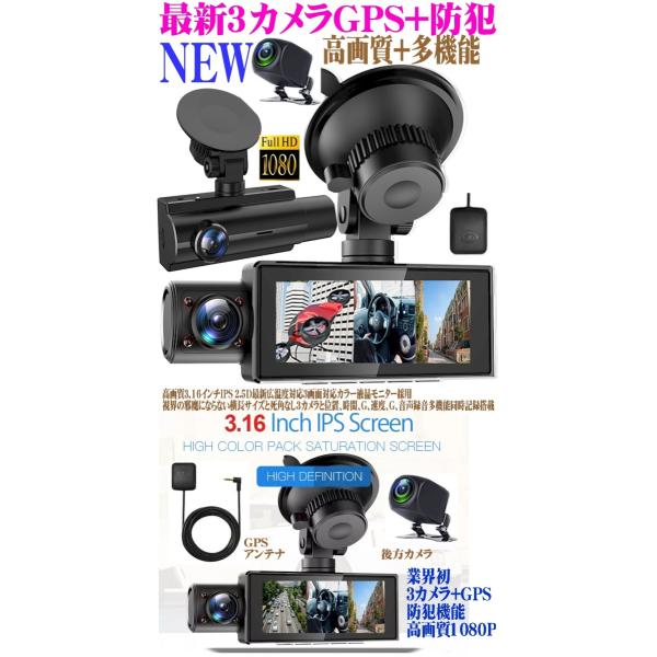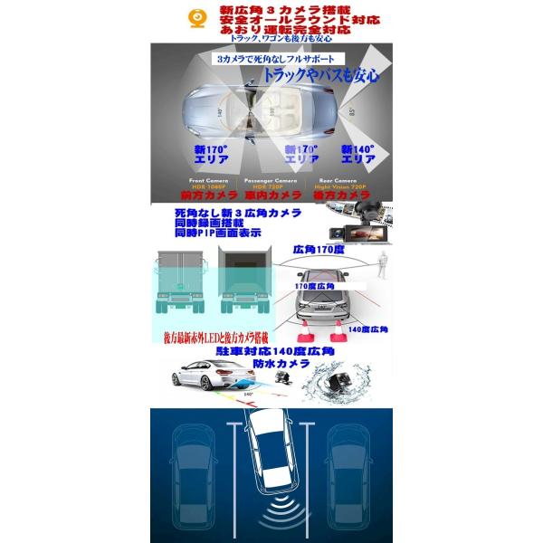 3カメラ ドライブレコーダー GPS 前後 車内 360度 最新 業界初 おすすめ 業務用 同時録画 3インチ 170度広角 自動連続録画 動体検知 駐車