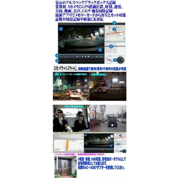 送料無料 新製品 業界初 GPS搭載 死角なし3カメラ同時録画最新フルHDドライブレコーダーです。GPSシラッキンク可能2カメラより多い前後、車内後方 車外車外の自動3同時記録ができるのでとっても便利です。SONY CMOSセンサー搭載写真 WDR HDR機能フルスペック 車の防犯、事故録画ドライブレコード 機能搭載!!連続上書き音声録画機能付だから停止した時間からさかのぼって再生。さらに衝突Gセンサー録画ロック機能やGセンサー動体モーション機能や駐車監視機能で人などの動体があると自動的に録画しますので防犯用にも使用できます。位置、速度、G、記録日時分秒と位置と音声、記録も一緒に記録されるので、証拠としても完璧ですSCSから最新の3カメラ搭載フルHDドライブレコーダー CARMONTYPRO 新発売タクシートラック大型車まで対応業務用としても可能な最新の3インチ高解像度モニター搭載 3カメラ同時記録付フルハイビジョン高画質ドライブレコーダー新登場。防犯カメラ、赤外線防犯カメラ、防犯録画システム 高画質ドライブレコーダー 防犯HDDレコーダー セール ランキング