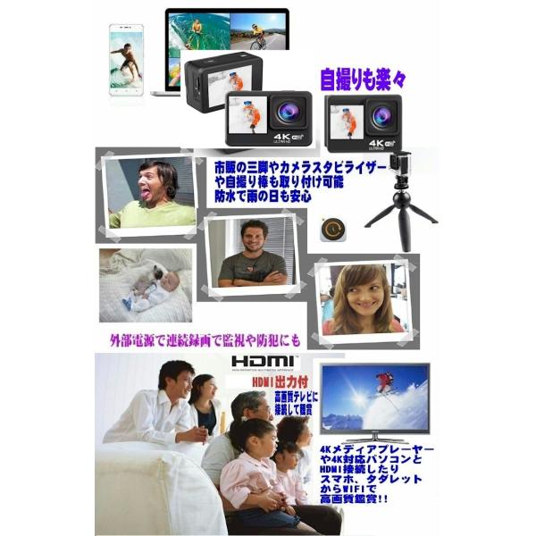 今なら業務用ピンマイク付イッテQなどアクティビティー番組で良く撮影されている最新のデュアルタッチモニター搭載アクションカメラが最近は人気です。最高性能で新発売新製品2022年7月モデルチェンジ4K60FPS高速とマイクロHDMI端子付き新発売4K60FPS高速になり170度広角6Gレンズ小型軽量で全ての動きを驚きの美しさで描き出す高解像度ハイスペック50mIPX8防水ケース付アクショカメラリモコン付モデルフルセット高解像度4KウルトラHDアクションカメラ腕装着広角170ワイド6Gレンズ搭載フルセット新しくなって従来よりUHD4K60fps高画質高速録画4世代V4チップセットとSONY4K高感度最新高性能センサー搭載スマホIphoneタブレットWIFIコントロールワイヤレス録画機能搭載タイムラプス、連続録画機能、連続撮影機能、高速録画スローモード 長時間露光機能搭載手に持つカメラから頭や目線で美しくスポーツ、ダイビング マリンスポーツ、スカイスポーツ自転車、バイク、車、人体に取り付けキット9種類と50m水中防水ケースが付属した4Kウルトラハイビジョン高画質録画最大2000万画素写真撮影ができる小型軽量の多機能アクションビデオカメラですなんとハイパワー電池もう1本付き 防災