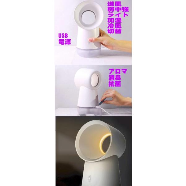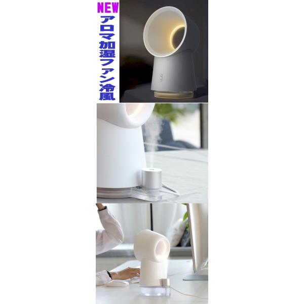 送料無料 新製品 業界初のミスト冷風扇風機と加湿器 電球色LEDライト付きサーキュレーター羽なしファン ・換気、消毒、加湿、保湿、冷風、ライトなどどこでも使用できるデスクトップ型羽なし扇風機。・ナノミストサイズ300nmで保湿 超音波式で加熱式に比べて1/100の省電力5W、そして安全です。・美容保湿や消毒やアロマディフューザーとしても使えます。・お手持ちのUSB電源2Aでどこでも動作しテーブルや会議室、車載やペットやデスクサイドでどこでも使える ・電球色のLEDランプ搭載でインテリアや睡眠夜間ライトとして!!・換気除菌消臭加湿で髪や肌の保湿や風邪やインフルエンザ、花粉予防、静電気防止に。・アロマオイルでアロマ芳香器としても使用できます。・美容液を入れてお肌の潤いにミスト美顔器としても。ファン3段階、ライト、加湿 単独オンオフ可能・アルコール、消毒液、薄めたジアナースアロマパウダー消臭消毒液を入れて強力除菌や消臭も抗菌消臭アロマディフューザー機能美容、保湿、消毒対応
