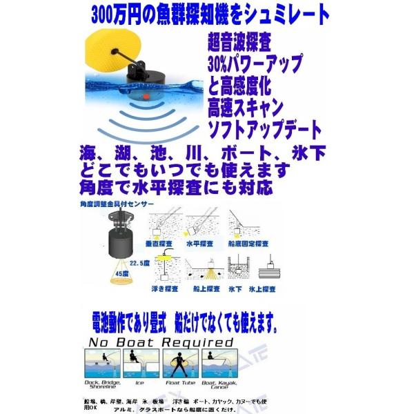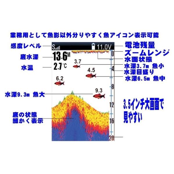 送料無料 300万円の魚群探知機をシュミレート2020年5月大画面カラー化だけでなくセンサー感度30%パワーアップと高感度回路化帯域 高速スキャンでの探索ソフトをバージョンアップ水深100m高感度調節付きで垂直?水平探査も可能。魚群探知機(魚探)さらに性能アップして新登場!!フジテレビの番組でも紹介され東京湾でたった1時間の釣果アジ98匹!業務用にもどうぞ!!水深最長0.6?100m、水温海面底の形状状態や魚群の3層まで確認できこの機能最大探査水深180mリアルグラフィック表示で業務クラス!!防滴、広温度保障、防滴構造を採用し釣りを知り尽くした最新の水深計付き魚群探知機。魚群の位置、底の状態をリアルにグラフィック表示魚群や水深を検知しアラーム発生。川、池、湖、海などの釣り場を選ばずどこでも使用可能。岸壁、橋の下、ボート、小型船、カヌー、カヤック、川湖海の中や表面が凍った場所でもフロー式なのでOK!!グラスファイバー、ビニール、アルミ製ボートなら船の底に置くだけ!!魚の水深が測れさらに感度やズーム機能、水深選択可能で探査できるのでとっても便利になりました。再入荷しました。