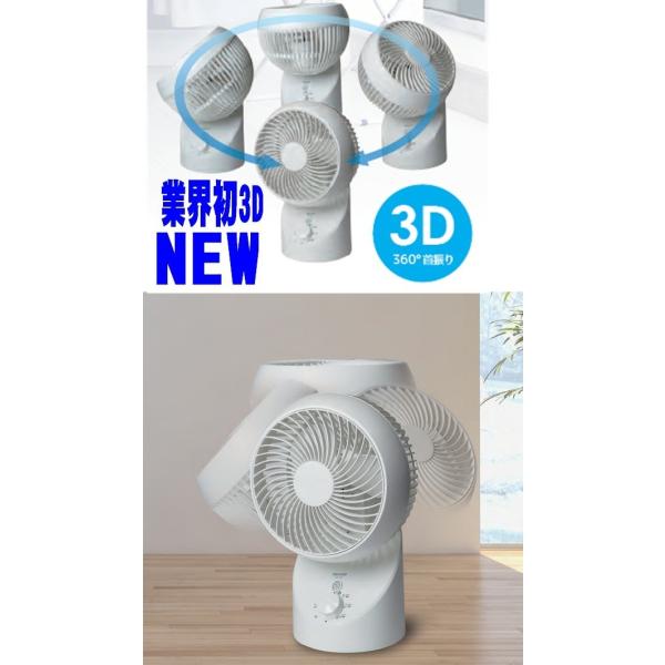 日本初3Dで360度自由に上下左右回転するサーキュレーター扇風機。直進性のある風でより遠くまで空気を360度自由に自動循環一般的扇風機は設置した場所の近辺の空気を動かしますがこの扇風機は360度直進性が高く遠くまで届く風を起こすため全室内の空気を効率よく循環させ部屋干しの洋服や布団タオルなどの乾燥や雑菌やかびやダニの繁殖を防ぎ広いリビングや2間続きのお部屋の冷暖房を効率的に行いたい時や帰宅時うどんだ空気をすばやく入れ替えたい時などに便利。お部屋の空気を循環させ上下の温度差を解消、足元だけ冷えたり頭がほてったりといった冷暖房の不快感を解消効率よい冷暖房。効率アップで電気代の節約にも効果的省スペース設置き3段階切り替えでムラがないハイパワーで静かな羽根。省エネ経済的。省スペース省エネで使える360度自動首振りテーブルフロアーやリビング化粧室など手軽に省スペースで設置。広い部屋やリビング、寝室、ゴニールハウスなどにも