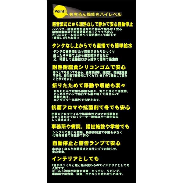 新製品 業界初洗濯機付国内大容量10Lの厚さ5cmになる折り畳式の抗菌消臭アロマ加湿器新登場!!病院の方や福祉施設様からのご要望が大変に多く当店が開発企画販売しました。短時間でのタンクの交換が面倒や室内の匂いが気になる、スチーム式だと高温なので不安などのご要望が多く実現しました。スチーム式や従来品に比べて新型の省エネマイクロミスト発生器で空気中の加湿効率も高く水滴が少ないのが特徴です。よりよくご購入していただくように価格も特価で送料も無料。さらに抗菌消臭アロマ1本付。冬から春の間は花粉対策や風邪対策、快適環境対策に加湿による体感温度も高くなり省エネ効果も高く春から夏の間はクーラーによる乾燥や梅雨の時期の消臭に秋から春の乾燥時期はからからで髪や肌のどが乾燥しかさかさ肌などの美容のトラブルや静電気が発生しやすくなり電子機器や家電などの故障の原因にもなります。お好きな水溶性アロマオイルを数滴入れるだけでアロマ芳香 器としても使え忙しい毎日のリラックス効果や睡眠効果にも抜群ランキングセール 別売送風ユニットでさらに加湿量を増やせます。今なら送風ユニット付属でさらに加湿量を増やせます