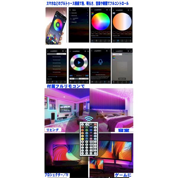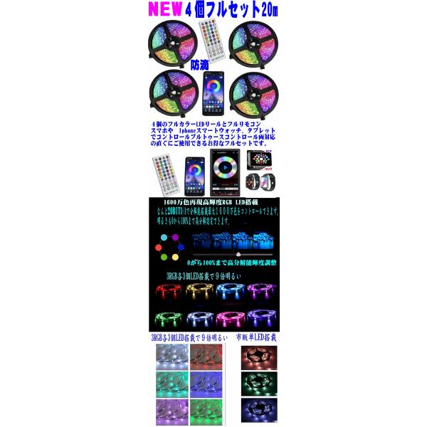 新発売 1600万色対応のイルミネーション RGB LEDテープ5m4本 20mと44キーフルリモコンとスマホ、Iphone、タブッレット、スマートウオッチにもブルートゥースフルコントロールの2In1対応のフルセットです。ACアダプター、コントローラー、LEDテープ4本、リモコン (電池別)のフルセットです。