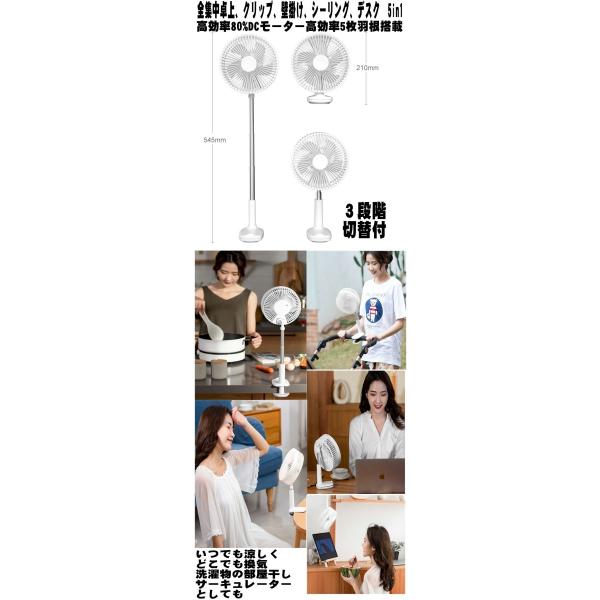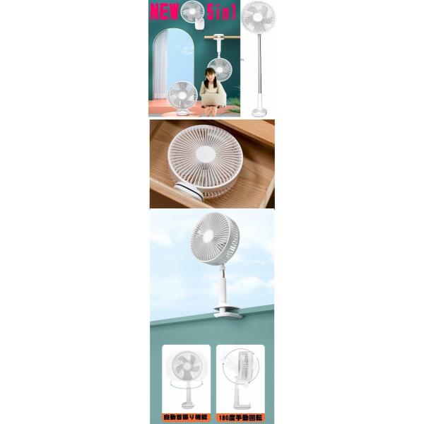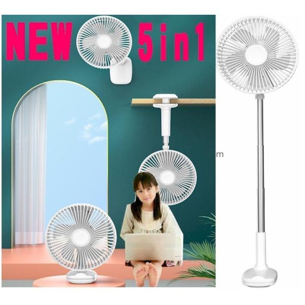 業界初全集中5in1 3wey壁掛けクリップシーリングファン、卓上デスクテーブル 高効率DCモーター採用自動首振り高効率5枚羽折りたたみ式でファショナブル、充電式なので持ち運びも楽々いつでもどこでも使えます。停電や落雷時やキャンプやアウトドア、デスクや化粧室、寝室でどこでも使える扇風機風量3段階切替 180度上下角度調節最大54.5cmまで伸ばせ扇風機だけでなくサーキュレーターとして使えます、車載やテントや狭いお部屋にも便利。窓を少し開けて換気や高温防止にとっても便利です。USB電源なのでお手持ちのスマホUSB ACアダプターやパソコンUSB端子、モバイルバッテリーやポータブル電源から充電でき連続使用も可能です。いろいろな場所に手軽に設置でき、デスクやテーブル、スポーツ後、お風呂上がりくつろぎの時間に自分だけの涼風も楽しめ勉強部屋、キッチン、化粧室、ベッドサイド、玄関などいろいろな場所でも使えます。特に部屋干し冷暖房の高効率サキュレーターとしても使えるのでとっても便利冷房クーラーと合わして使用しても効率アップが期待できます省エネクールビズにも最適です。