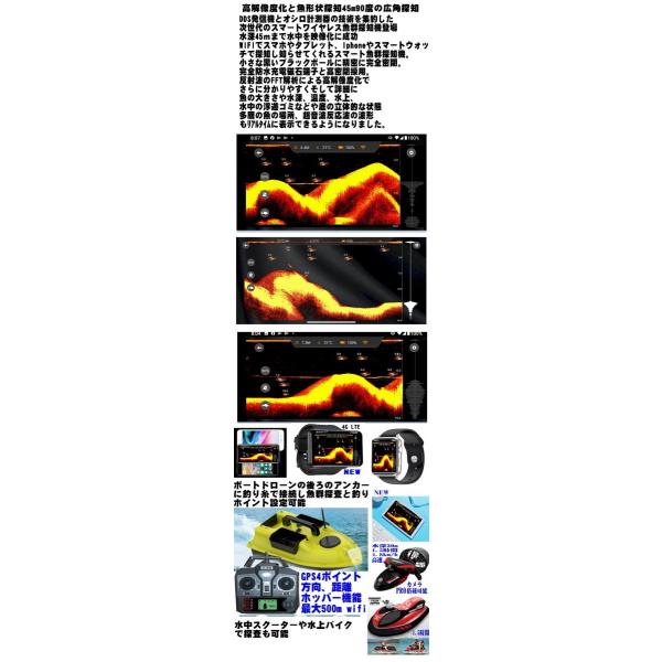 送料無料 ワイヤレス魚群探知機次世代スマート魚群探知機ポケ探スマホ タブレットやiPhone スマートウォッチとWIFI接続して70mまでワイヤレスで使用でき本体は小型軽量なのでつり糸に取り付けてご使用いただけます。高解像度立体多層高感度調節付きで魚群探知機(魚探)さらに性能バージョンアップして新登場!!フジテレビの番組でも紹介され東京湾で1時間の釣果アジ98匹!業務用にもどうぞ!!水深水温(気温)測定対応。水面水中水底の形状や魚群の多層まで確認でき最大探査水深45mリアルグラフィック表示で世界最小最軽量クラス!!防水広温度保障構造を採用し釣りを知り尽くした最新の温度計、水深計付きのスマート魚探。魚群の大中小、位置、底の状態をリアルタイムにグラフィック表示し、検知アラーム機能も搭載。川、池、湖、海など釣り場を選ばず使用でき、もちろん岸壁、橋の下、ボート、小型船、カヌー、カヤック、水中や表面が凍った場所でもフロー式なのでOK!!グラスファイバー、ビニール、アルミ製ボートなら船の底に置くだけ!!3層までの大小魚の水深が測れ、さらに感度やズーム機能も可能で探査可能。