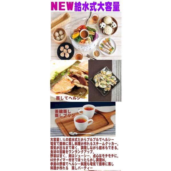 食材そのままの味や栄養分が楽しめヘルシー料理の幅が広げられるほったらかし給水式タイマー付き。素材そのままの味で、ヘルシー!野菜や魚、肉類、蒸餃子、茶碗蒸し、蒸パン、ロールキャベツ、蒸しゅうまい、肉まんあんまん、肉や貝、魚などを蒸すことによりとってもヘルシーな料理が楽しめます。簡単調理時間短縮、5分〜30分蓋を開けずにタイマーと給水、手軽に簡単に蒸し料理が作れます。余分な油を使わないのでヘルシー。火を使わない電気蒸し器だから安心タイマー付きでおまかせ調理ができ便利。調理後は自動でオフ。<BR>普段あまり料理をしない男性でも