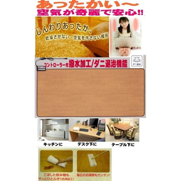 クリーン暖房でやさしい暖かさで省エネ経済的!!デスク下、テーブル下に人気のフローリングに便利なダニ退治機能付き撥水加工木目ライトブラウンフローリング電気ホットカーペットです。